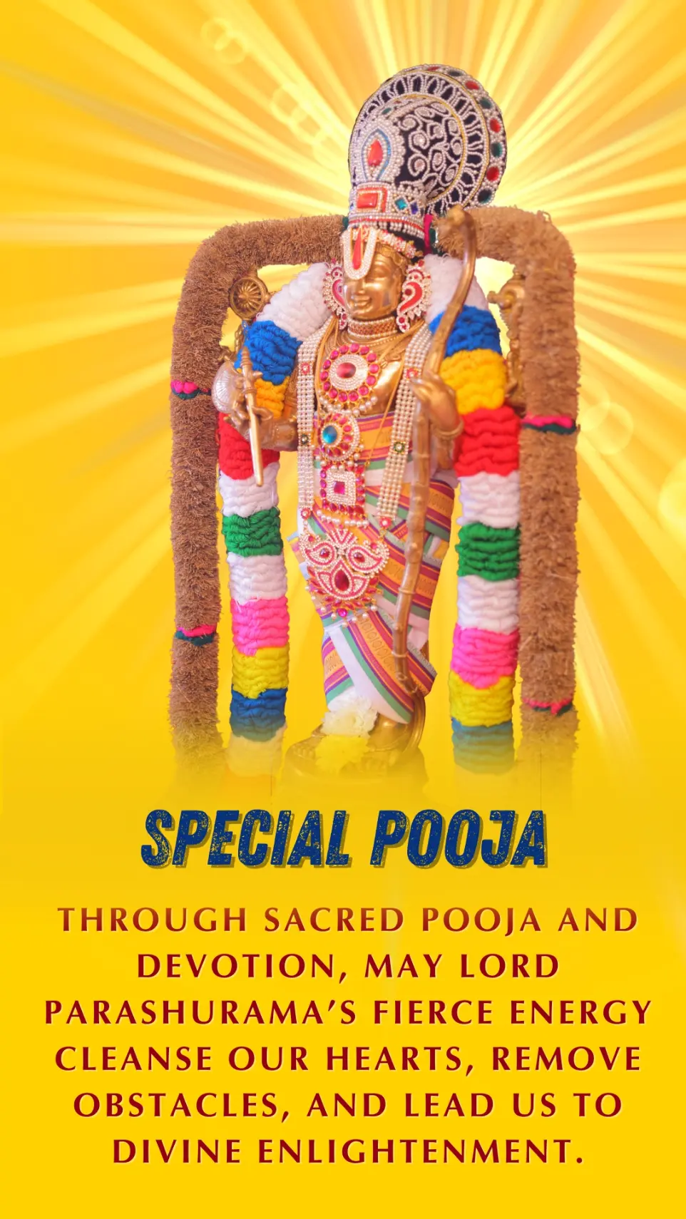 Special poojas, invoking Lord Parashurama’s divine presence through sacred rituals. Devotees offer flowers, tulsi leaves, and traditional naivedyam while chanting mantras. Temples conduct homams, archana, and spiritual discourses on his legacy. Fasting and charity are encouraged, symbolizing righteousness and strength. Worshippers seek his blessings for wisdom, courage, and dharmic living, following his path of justice and devotion.