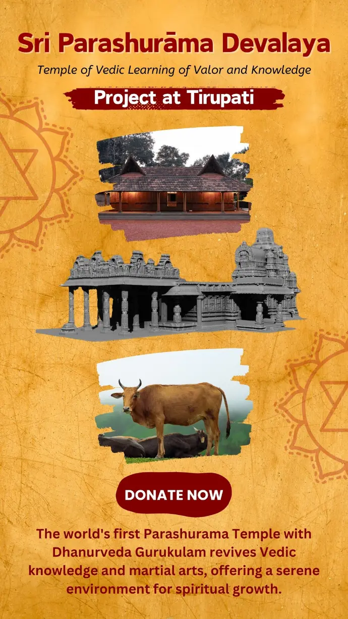 The lord Parashurama Temple and Dhanurveda Gurukul project in Tirupati is a groundbreaking initiative to revive India's ancient martial arts and archery traditions from the Dhanurveda. With a full-stone lord Parashurama Temple as its centerpiece, crafted in line with Shilpashastra, this project offers a holistic Gurukul education in martial arts, spirituality, and intellect. By promoting Hari Nama and cultural heritage, it attracts pilgrims and scholars, blending spirituality with physical training for learning experience.